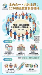 - 2026協同會南區教會聯合禮拜, 時間:3/8(日) 上午7:30(教會集合出發,共乘遊覽車前往)~18:00(回到教會), 活動地點:屏東科技大學,邀請弟兄姊妹闔家參與,也歡迎慕道友參加。請在大群組填寫報名表單,並向春柑繳交報名費(每人200元)、自駕前往(每人100元),報名至2/8(日)截止。