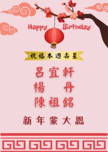 - 祝福本週壽星(2/1日~2/6六):呂宜軒、楊丹、陳祖銘,生日快樂、主恩滿溢 !
